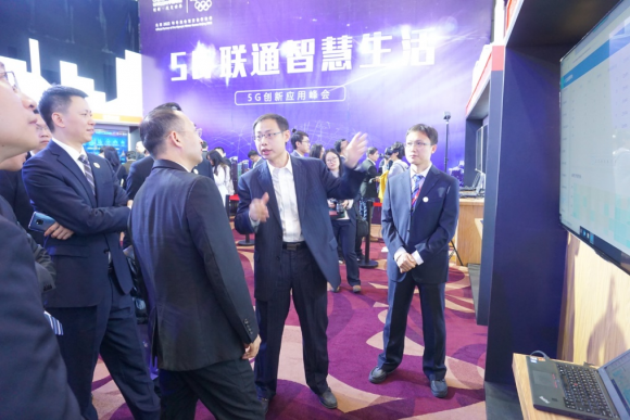 国双助理总裁彭俊(中)正在国双展台为到访嘉宾展示司法和工业互联网解决方案