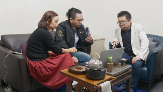 (开发团队进行探讨,左:陈玲,中:韩回之,右:王益涵)