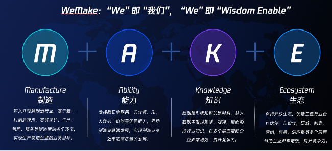 WeMake是腾讯云深入并理解制造行业,基于新一代信息技术,发挥腾讯物联网、云计算、AI、大数据、协同等优势能力重磅打造。与此同时,WeMake以“制造”为底,融合了能力、知识、生态三大维度,构建了四位一体的制造业数字化升级方案。