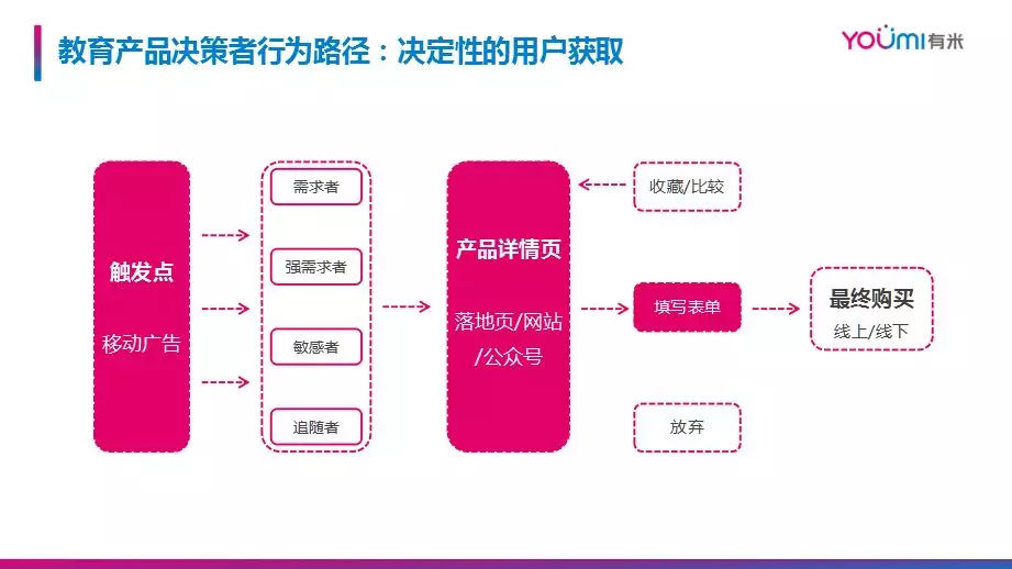 移动广告作为链条触发点,定向投放至不同程度的需求者移动端,对广告感兴趣的用户点开产品详情页后,对产品产生欲望而填写表单,最终实现线上或线下的购买,而如何在每一层滤网处达到高转化正是广告主所关心的问题。对此,有米科技教育行业优化团队自有一套方法论。