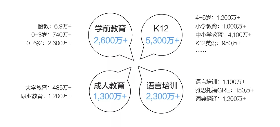 针对以上三大类产品,我们基本可以区分三类目标人群:K12教育-家长类人群、成人教育-成年学习者、技能培训-其他类别人群(如企业HR)。