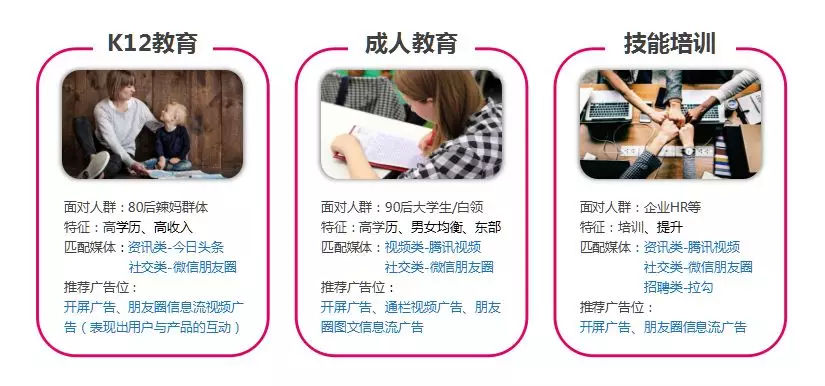 其中以成人教育中的公考产品为例,其面向的人群主要为毕业前后1-2年内的大学生和高学历白领,所以针对大学生一般选择具有娱乐性质的视频类媒体进行投放,如腾讯视频开屏或通栏视频广告位;针对白领则选择高学历人群聚集的社交类媒体为多,详情可见下图。