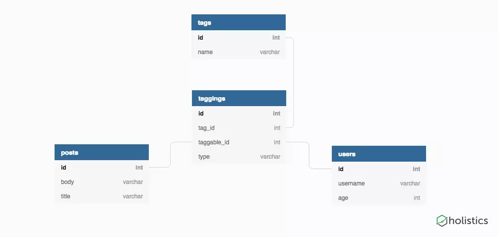 CREATE TABLE posts ( id SERIAL, body text, title varchar(80) ); CREATE TABLE tags ( id SERIAL, name varchar(80) ); CREATE TABLE tags_posts ( id SERIAL, tag_id integer, post_id integer );