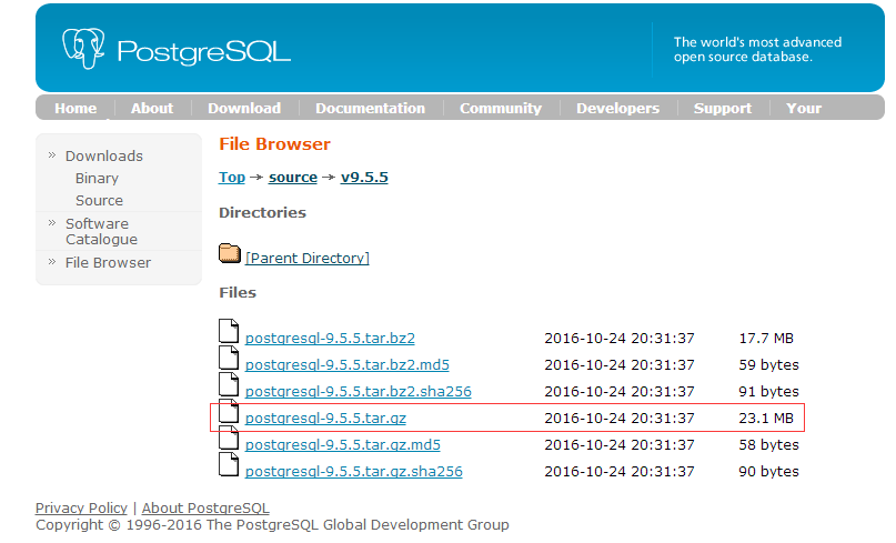 如上图,可以看到提供了两种压缩格式,此处我们选择postgresql-9.5.5.tar.gz,下载完成后上传至CentOS服务器的指定目录即可。