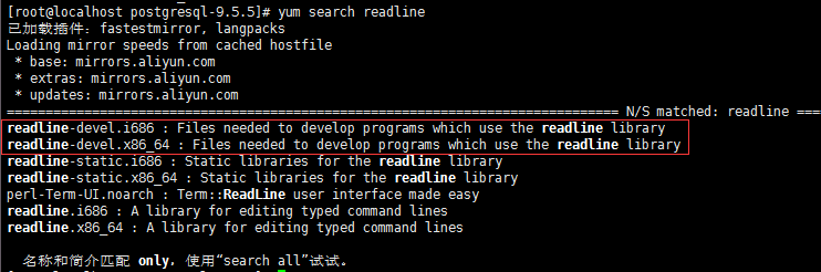 那么肯定还是缺少与readline相关的包了,通过yum search readline进行搜索可以发现一个readline-devel包,如下图: