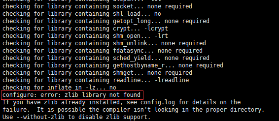 安装完成后再次编译postgresql,还是报错,这次提示缺少zlib库:
