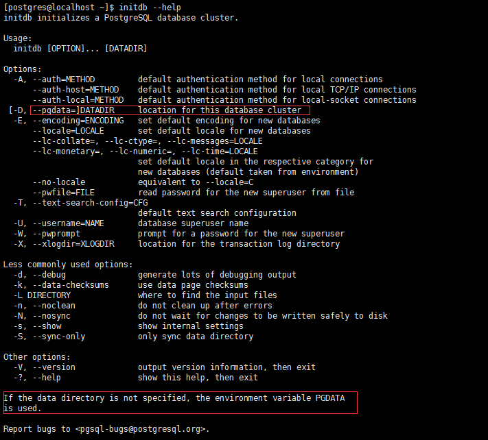 由于配置了环境变量,所以此处我们直接执行initdb即可完成db初始化,但在这之前我们可以通过initdb --help看一下初始化相关的帮助信息: