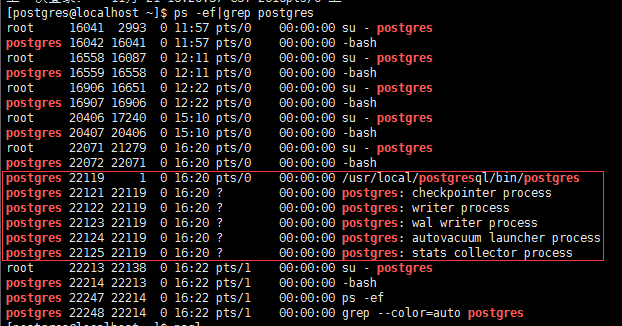 或者通过ps -ef|grep postgres查看一下postgres相关是否存在相关进程,如下图也可以说明已启动成功: