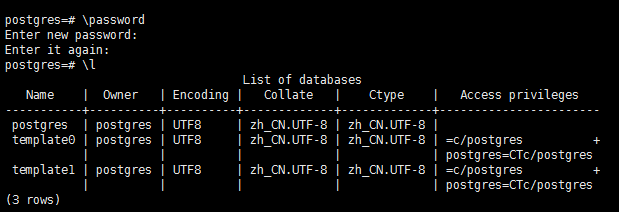 接下来要做的第一件事就是设置postgres用户的密码(默认为空),用psql连接成功后直接输入\password即会提示输入两次密码,如下图: