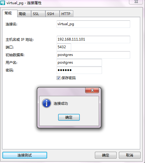 此处我们暂且将密码修改为111111,通过\l命令即可查看数据库列表,关于psql工具的使用在此处就不再做过多赘述。最后也是最重要的一点就是验证非本地客户端工具的连接了,毕竟我们是要做数据库服务器的,这里我选择的工具是Navicat Premium,在主机(Windows7)打开Navicat与虚拟机中的postgresql服务器进行连接测试: