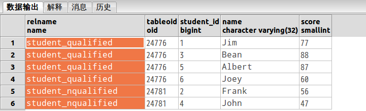 创建了两个分区表,student_qualified和student_nqualified,继承了大表student的一切字段,同时设定了约束,即CHECK条件。