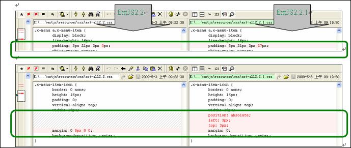于是,比较2.2.1和2.2两个版本,发现在resources/css /ext-all.css的相关样式上存在差异,如下图: