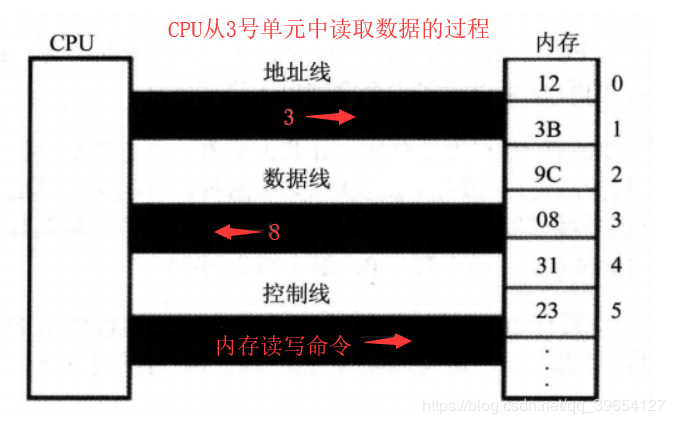 3、 存储器将3号单元中的数据8通过数据线送入CPU。写操作与读操作的步骤相似。
