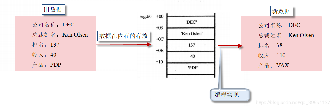 data segment a db 1,2,3,4,5,6,7,8 b dw 0 c dw a, b ;等价于c dw offset a, offset b ;数据标号c处存储的两个字型数据为标号a、b 的偏移地址 data ends data segment a db 1,2,3,4,5,6,7,8 b dw 0 c dd a,b ;等价于c dw offset a, seg a, offset b, seg b ;数据标号c处存储的两个双字型数据为标号a的偏移地址和段地址、标号b 的偏移地址和段地址 data ends
