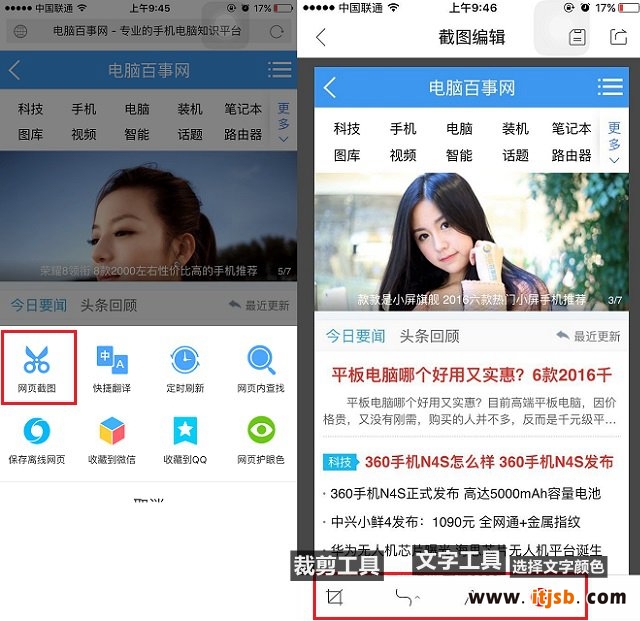 二、继续点击进入“网页截图”,在网页截图界面底部主要提供有裁剪、文字工具以及文字颜色设置等几个功能,如图。