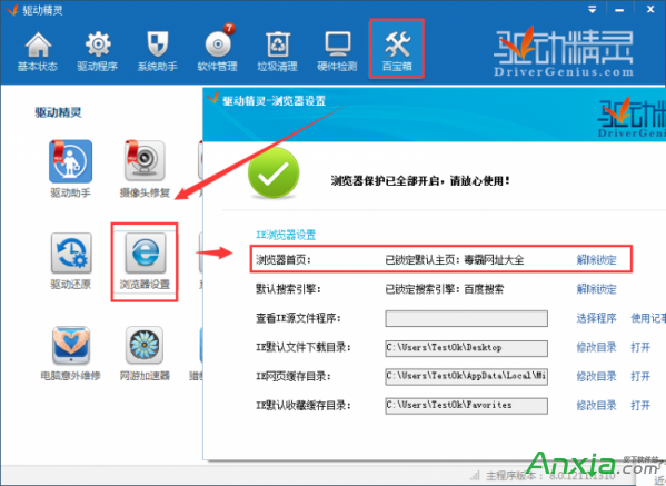 不想卸载驱动精灵,打开驱动精灵-百宝箱-浏览器保护-解除主页锁定并锁定2345,如图: