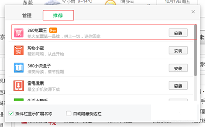 打开“扩展”后,在弹出的对话框中,点击“推荐”,在这里可以看到360抢票王的插件,然后安装就可以了!
