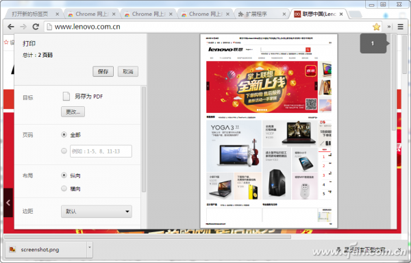 如果前面的两种方法都不甚满意的话,还可以试一试浏览器的功能扩展。这些扩展会使得浏览器的功能大大的延伸,当然这也就包括对网页的截图操作。如果使用的是谷歌浏览器,首先进入到“Chrome网上应用店”,搜索查找一款名为“剪影截图”的功能扩展,安装完成后会在工具栏中看到该扩展的图标。以后当需要截取网页页面的时候,只需要点击一下这个扩展图标,接着在弹出的菜单中选择“截图整个页面”命令。稍等片刻浏览器就会打开一个新的标签,在右侧窗口中就可以预览到截取的效果。如果对效果满意的话,那么点击左侧列表中的“保存”按钮,就可以将图片保存为PDF文件了(图3)。最后将PDF文件转换成需要的任意的图片格式,也就完成相应的截图操作了。