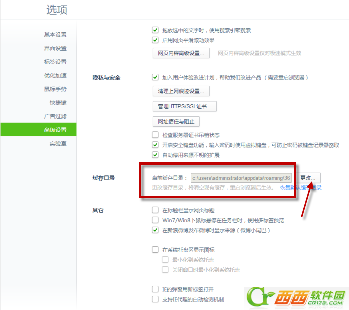5、可以看到360浏览器的缓存目录,您也可以对其进行更改