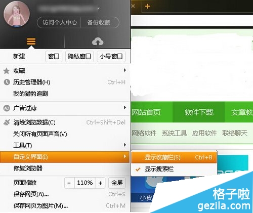 1,点击自己的猎豹浏览器账号头像,在弹出的菜单中找到并点击自定义界面,然后勾选收藏栏就可以了,这样猎豹浏览器状态栏上就显示出收藏来了,快去操作吧。