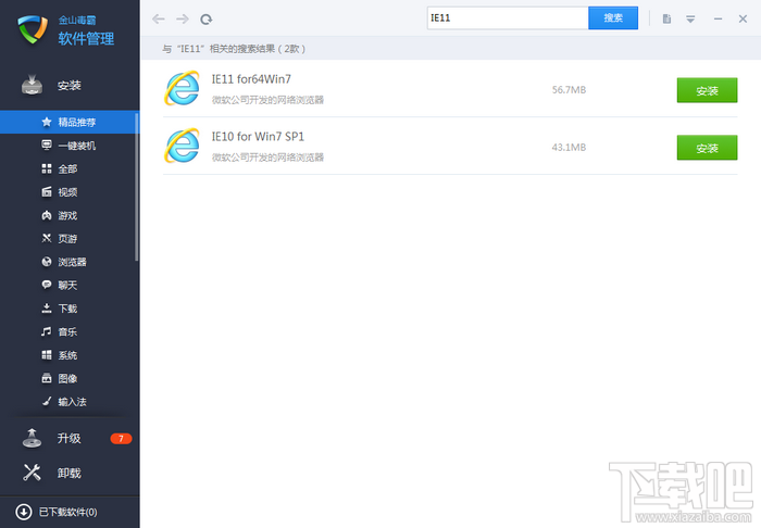 使用360安全卫士中的软件管家、金山毒霸软件管理等软件,直接搜索最新版本的IE浏览器,比如"IE11"直接安装就OK了。