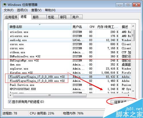2、任务管理器出现没响应的时候,也可以这样 结束 flash 的进程来解决