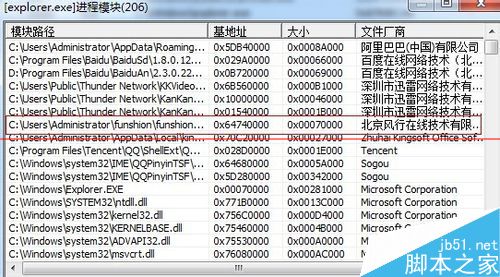 4、在弹出的窗口中,按照文件厂商排序,可以看到进程Explorer.exe中被插入了其他公司的程序。