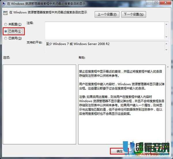 3、双击在windows资源管理器搜索框中关闭最近搜索条目的显示设置,在弹出的窗口中点击“已启用”,再点击“应用——确定”即可,如下图所示: