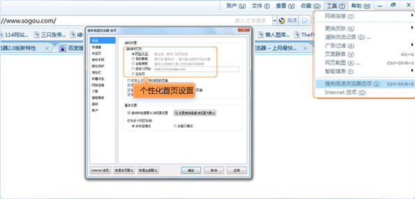 菜单选项中的设置方法:点击菜单栏工具选项,然后点击搜狗高速浏览器选项;在常规的启动设置中,可以自由设置“网址大全”、“我的最爱”、“全能搜索”、“自定义网址”和“空白页”这五种类型,如下图所示。
