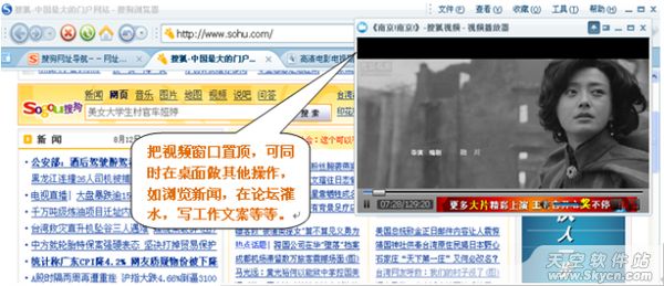 把视频置顶在一角后,我们就可以在桌面做其他操作,如浏览新闻,在论坛灌水,写工作文档等……