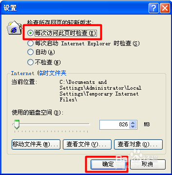 6、并从弹出的“设置”窗口中勾选“检查所有网页的较新版本”栏目中的“每次访问此页检查”项。最后重启一下浏览器。