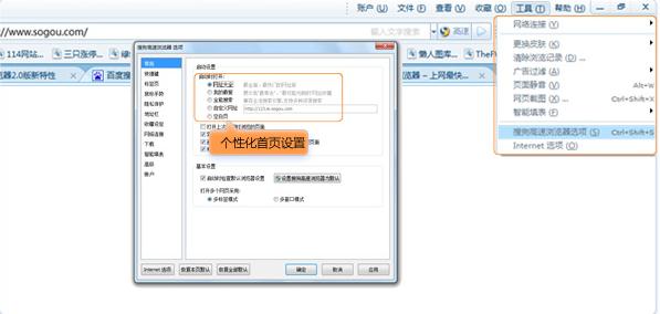 菜单选项中的设置方法:点击菜单栏工具选项,然后点击搜狗高速浏览器选项;在常规的启动设置中,可以自由设置“网址大全”、“我的最爱”、“全能搜索”、“自定义网址”和“空白页”这五种类型,如下图所示。