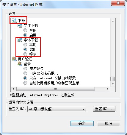 3. 在 [安全设定] 视窗中,滚动到 [下载] 区域,参考以下说明设置 [字体下载] 的方式,设置完全后单击 [确定] 按钮。