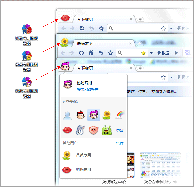 您是否经常与亲友共用电脑?您想要将自己的收藏夹、皮肤、扩展、浏览历史和设置与其他人区分开吗? 您可以在360极速浏览器里添加新用户,不同的用户使用不同的用户窗口,从而让使用同一台电脑的所有用户都能拥有各自的个性化360极速浏览器。