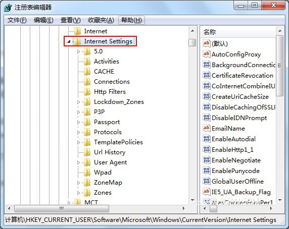 2、进入HKEY_CURRENT_USERSoftwareMicrosoftWindowsCurrentVersionInternet Settings。