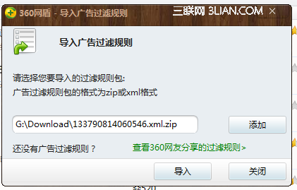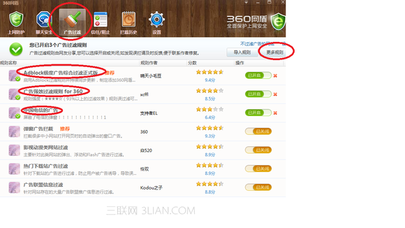 3. 跳出360网盾,点更多规则,去下载图上三条规则的最新版,另外记得定期上网看看这三条规则有没有更新,有更新请尽量更新以保持最佳屏蔽效果(一定要配合 360浏览器使用,我试过用搜狗,结果网盾基本没用)【其中最重要的是第二条规则一定要用,其他规则不开问题也不大,不过不要盲目的规则全开,会拖慢浏览器速度的】