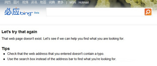 如果我们选择“天气”选项,因为 Bing 中文版目前还没有提供天气服务,就会直接显示“该页不存在”的错误提示。