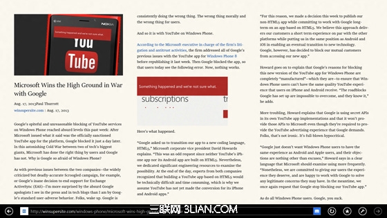 IE11主打特性之一是Reading View,希望给用户带来更好的阅读感受。点击网页,浏览器会自动判断用户阅读需求,然后并在地址栏的右侧生成Reading View按钮。