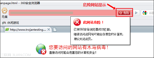 另外,当您访问的网站是木马网站或者欺诈网站时,该地址栏会变红、铭牌显示“危险”,避免因为访问这类网站造成损失。