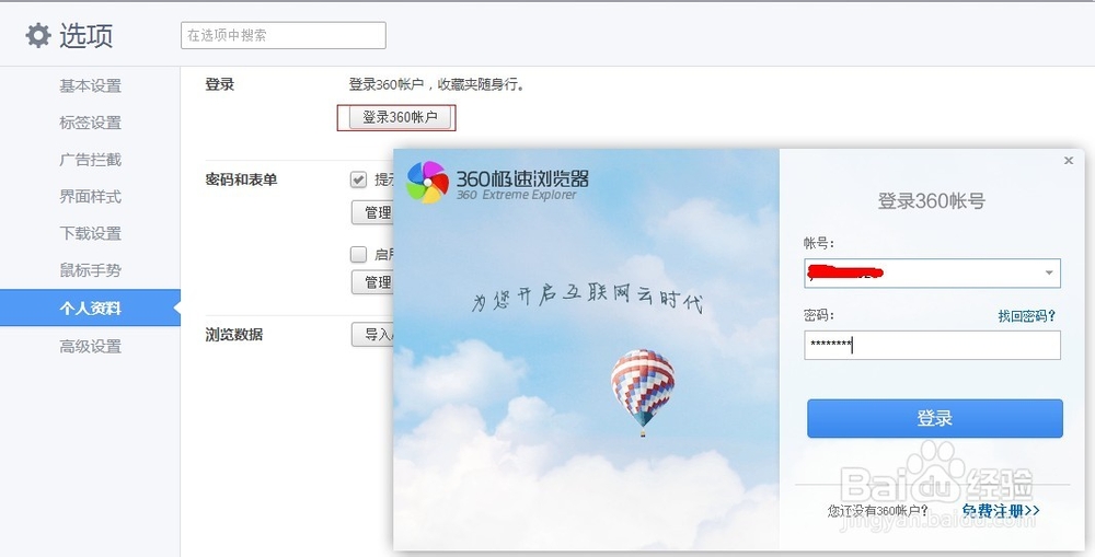 或者进入“选项”页面的“个人资料”,点击“登录360账户”,输入360账号登录即可