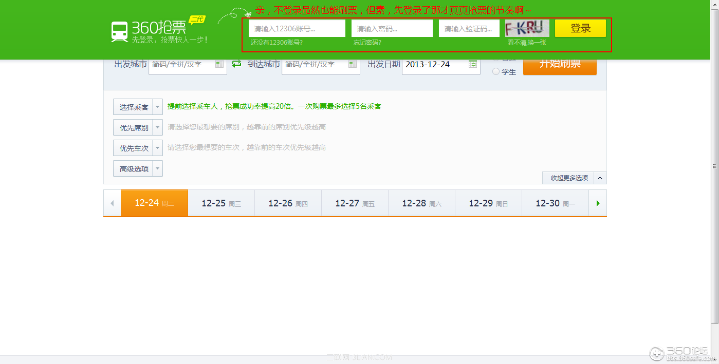 1. 安装最新版抢票插件,访问“360抢票二代”http://pc.huochepiao.360.cn,登录12306帐号