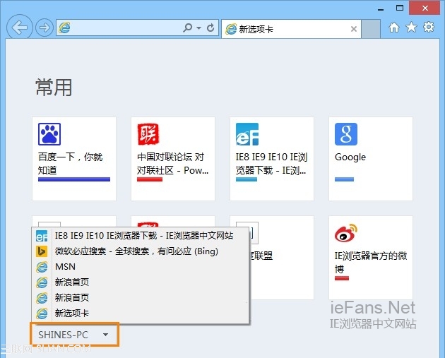 在桌面版IE11下,我们只需要新建一个空白的选项卡页,在“常用网站”的区域下面会显示已经同步的系统名称,单击该名称即可打开另外一台电脑已同步的选项卡列表。