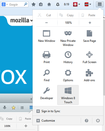 Mozilla团队还对菜单进行了彻底的重新设计,增加了大部分其他浏览器所没有的许多订制选项。尽管火狐一直都是高度订制化的,但这一新版本帮助用户更方便地发现订制选项并使用。只要点击菜单中的“订制”按钮并拖拉菜单元素,用户就可以改进用户体验。