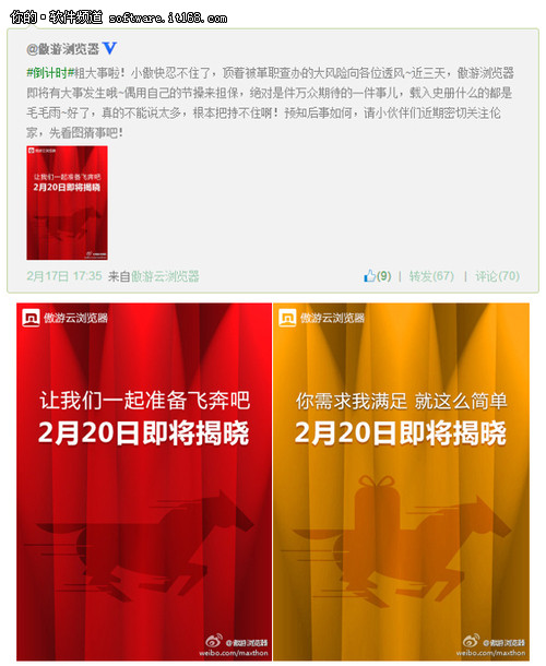 马上有钱,马上有对象,马上有车子,马上有房子……只要跟“马”沾边,心中就能做到“无码”,拥有一切。等等~,我好像明白了什么?!就在前几天傲游浏览器官方微博上爆料出2月20日将要发生一件值得万众期待的一件事儿,居然还说载入史册什么的都是毛毛雨。最初一副红色的背景上一匹奔驰的骏马,而后又放出一副黄色的背景,马上多了一个礼物盒,就连官微的背景也做了红色的改版,这是神马节奏??难不成要改名红马浏览器?猎马浏览器?还是要IPO了?或者要卖身求荣了?不过卖个身也不用这么自豪和兴奋吧?节操呢?!作为专注浏览器老牌厂商,傲游这个品牌怎么也不至于堕落到这步田地吧?一连串的爆料的确吊足了大家的胃口,众说纷纭,小傲这个萌卖的真是够劲,到底葫芦里卖的什么药呢?