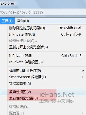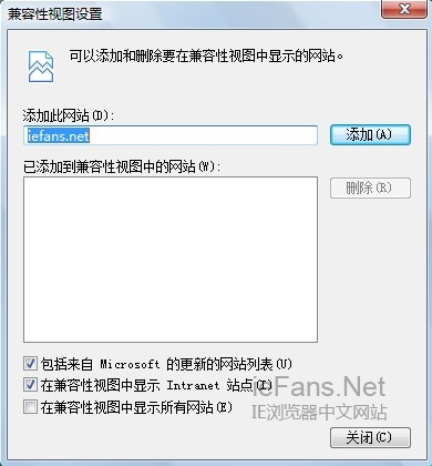 “兼容性视图设置(B)”。点击这行文字会出来一个对话框(如右下),这是“可以添加和删除要在兼容性视图中显示的网站”。右图是在浏览本网站时点击“工具”的,因此在“添加此网站(D)”里就出现网站的域名:[iefans.net]。只要点击右面的“添加(A)”,这个网站域名就会进入“已添加到兼容性视图中的网站(W)”的文本框内。经添加后,再浏览本网站就会自动进入“兼容性视图”模式了。