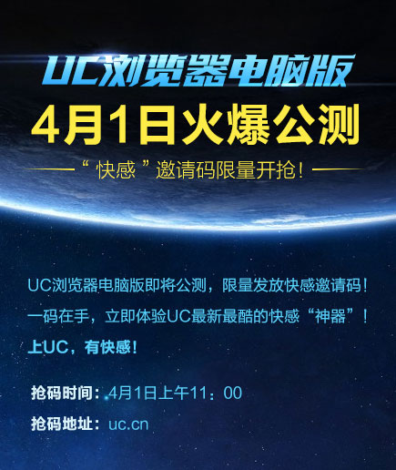 4月1日是愚人节,同时在这一天,UC浏览器电脑版正式登陆地球,巅峰快感,极速来袭,今天上午11点钟,UC浏览器电脑版将限量发放公测邀请码,一码在手,立即体验UC最新最酷的快感“神器”,需登录UC账号才能抢码哦,赶紧来抢吧。