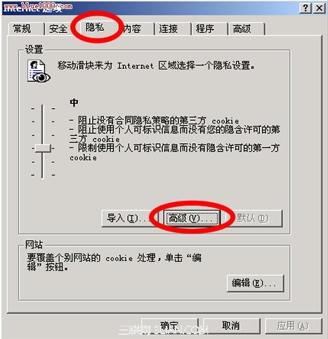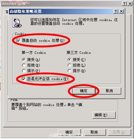 从“工具”菜单中选择“Internet 选项”。 单击“隐私”标签。 单击“高级”按钮,按下列步骤进行设置。 设置完成,重新启动IE即可。(关闭IE再次重新打开)