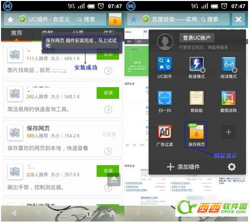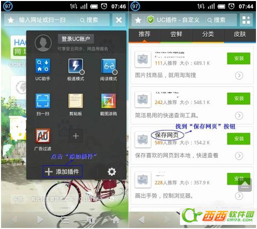 2、点击UC浏览器右上角的按钮,弹出“插件管理”窗口。点击“添加插件”按钮,在“推荐插件”里面,可以找到“保存网页”插件。