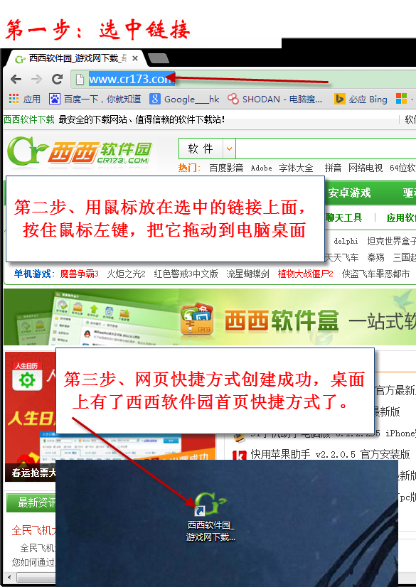 像firefox和chrome在右键里都没有办法创建快捷,直接把网址旁边的图标拖拽到桌面上 。