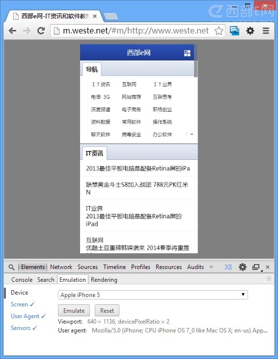 4、这个界面就一目了然了,Device里面可以选择各种手机或者平板设备,大概有20种之多。User Agent和Sensors显示了模拟的数据。点击“Emulate”按钮就可以生效了。